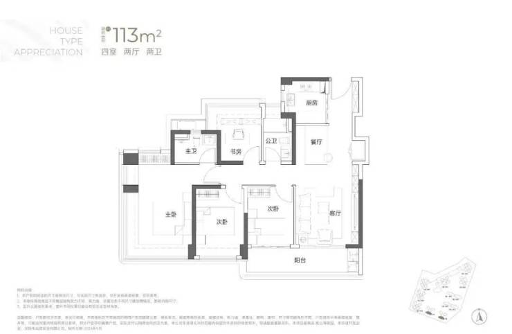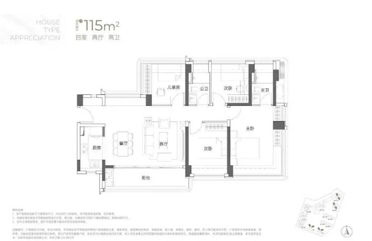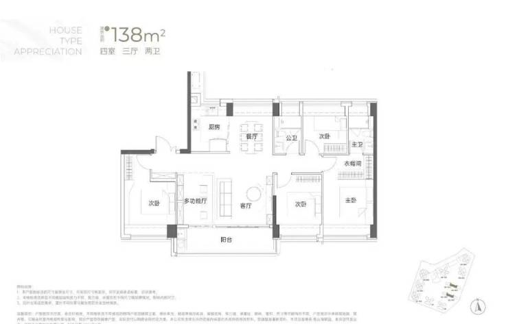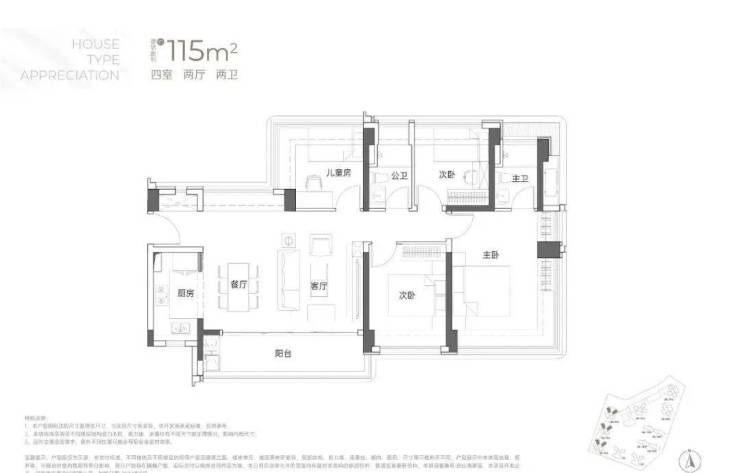 竖庭格局,西南向,基本居住功能与建面约108-110㎡4房2卫一致,但格局不一样,从目前公布的户型图上看,主要是主卧空间有了更大的提升,比如可以放更大一点的衣柜。