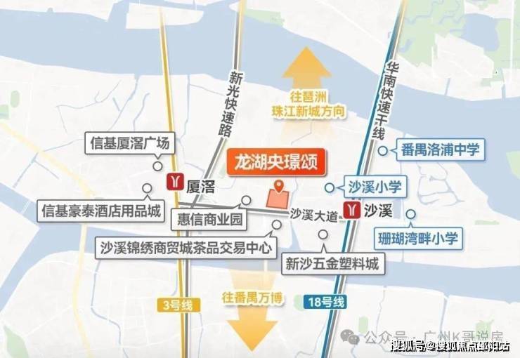 距离18号线沙溪地铁站约600-700米,18号线1站万博,2站琶洲,3站珠江新城。