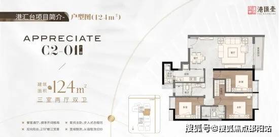 124㎡三房两厅两卫,餐客通厅,拥享开阔格局,套间主卧,步入式衣帽间,双向阳台,270度瞰江赏景,宽绰厨房,从容取洗切炒