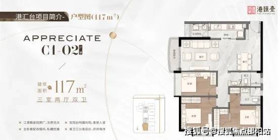 117㎡三房两厅两卫,阳台飘台视野广,无界风光,主卧奢配衣帽间,私藏优雅双阳台向阳,美景釆光入室,客卫三分离设计,井井有序