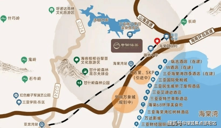 依山傍水,拥享1500余亩南田温泉;②出则繁华、入则鸣翠,缔造海棠湾山海度假标杆!