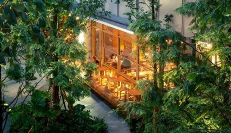 以「自然景观」为设计语言,立体绿植墙、外摆移动花箱、移动树池、通透玻璃幕墙与光影互动,构建出呼吸感十足的森系场景。错落的休憩座椅与阳伞、绿植美陈艺术装置、吧台连廊,将户外野趣融入建筑肌理,让每一步都成为“森林漫步”。