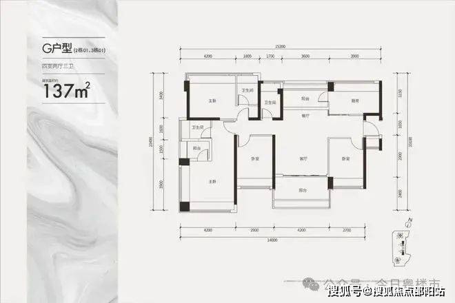 建面137㎡四房三卫:双套房设计,主卧带独立衣帽间及卫浴,私密性极佳