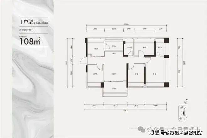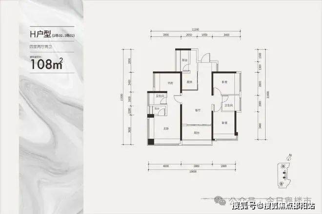 建面108㎡四房:双龙抱珠格局,客餐厅一体化设计,南北通透