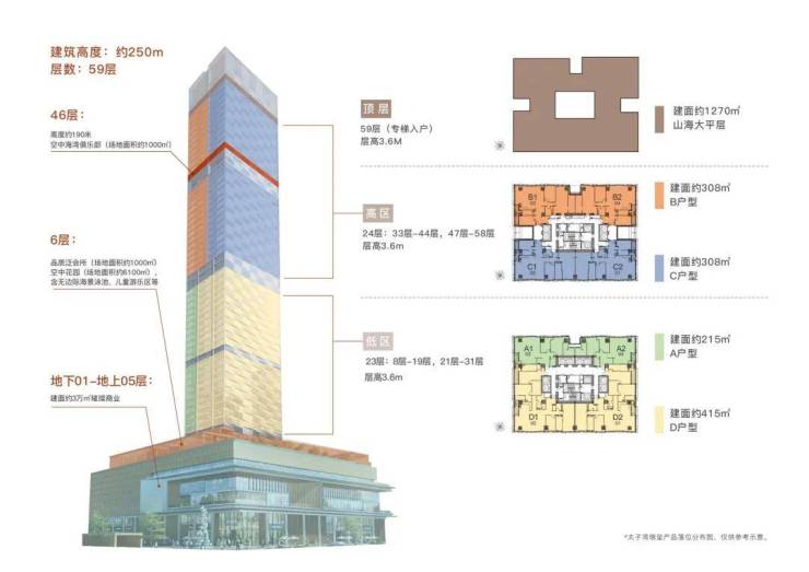 楼层高:59层(低区8-31层,高区33-58层避难层20/32层)
