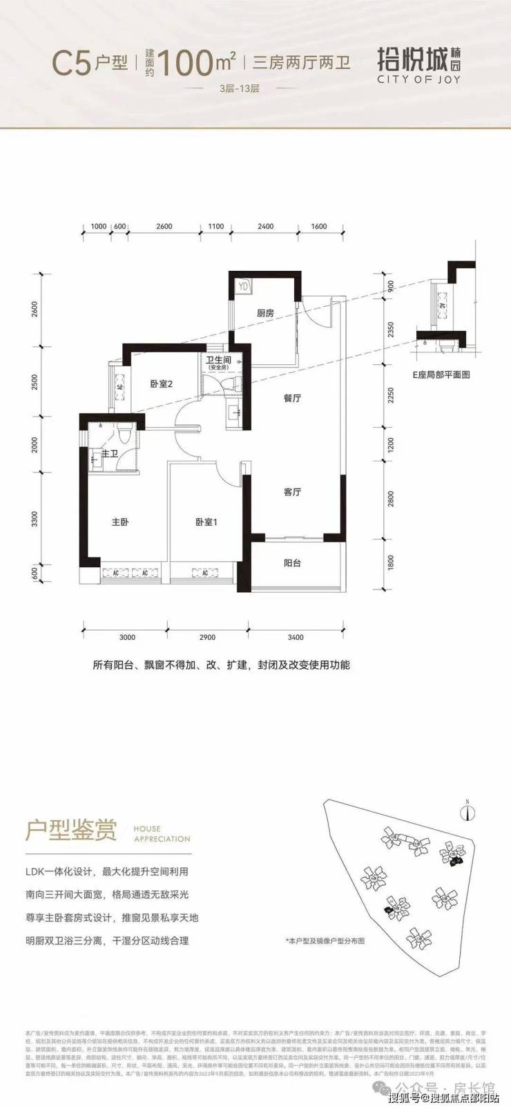 100㎡的3房2厅2卫,设计的是竖厅格局,进门入户玄关,客厅3.4米开间,LDKB一体化设计,3个卧室分别做到了3米/2.9米/2.5米的宽度,U型厨房,公卫三段式分离,得房率:77.14%(不含赠送),阳台1.8米宽度,西南或东南朝向。