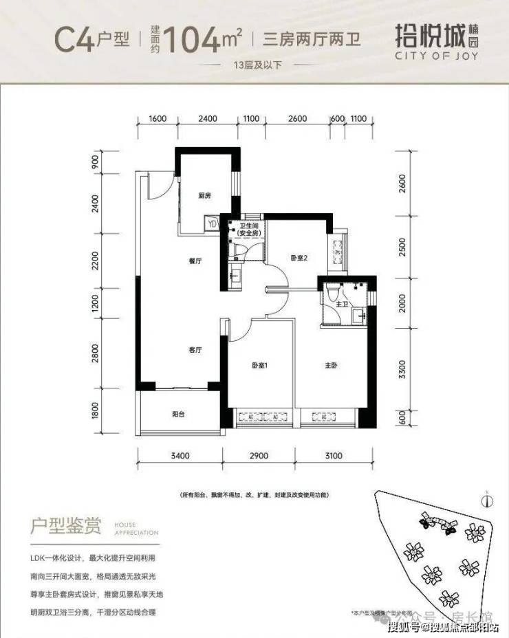 104㎡的3房2厅2卫,设计的是经典竖厅格局,进门入户玄关,客厅3.4米开间,LDKB一体化设计,3个卧室分别做到了3.1米/2.9米/2.5米的宽度,U型厨房,公卫三段式分离,得房率:76.21%(不含赠送),阳台1.8米宽度,西南或东南朝向。