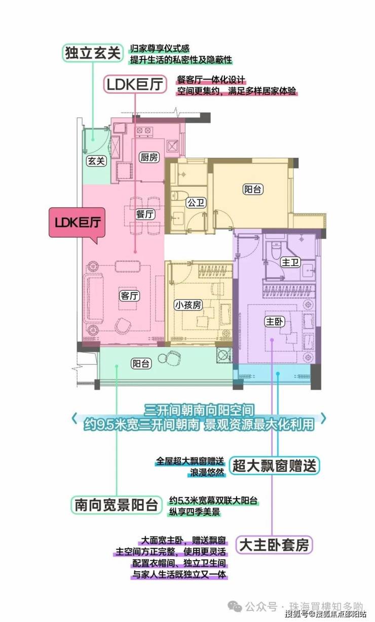 独立玄关+LDKB多空间联动+三开间朝南+南向大阳台+全屋飘窗赠送+尊崇主卧套间