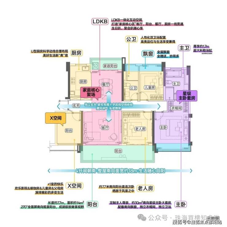 尊享豪宅私属十字格局+LDKB多空间联动+四开间朝南+南向约7.7m超大面宽阳台+全屋阳台约28㎡+超大飘窗赠送+约30㎡尊崇主卧套间