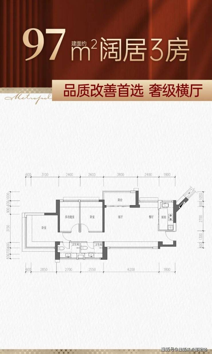 94㎡的3房2厅2卫,设计的是横厅南北通透格局,客餐厅6.3米开间,LDKB一体化,四开间朝南,卧室全南向,3个卧室分别做到了主卧15.3㎡/次卧8.5㎡/次卧8.16㎡(包含墙体飘窗),L型厨房,公卫三段式分离,得房率约77%(不含赠送),阳台主朝东北向。97㎡的3房2厅2卫,设计的是横厅南北通透格局,客餐厅6.2米开间,LDKB一体化,四开间朝南,3个卧室分别做到了主卧13.87㎡/次卧8.58㎡/次卧7.92㎡(包含墙体飘窗),L型厨房,卫生间干湿分离,得房率约77%(不含赠送),阳台主朝东北向。