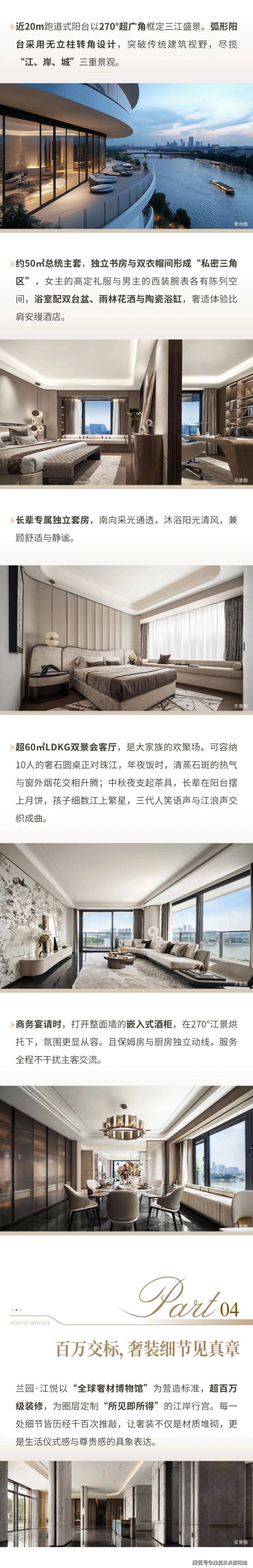为时代领航者定制生活勋章🏅不只是空间的奢华表达✨更划定珠江岸“峯居生活”新高度🏡约60㎡LDK 社交场|定制圈层排场新体验🥂餐厨客无界融合,打破空间桎梏商务磋商、家族宴叙自如切换每一次社交,都是塔尖圈层的风尚秀场270° 环幕瞰江阳台|私藏珠江四季风华🌁晨光中观江浪奔涌,暮色里赏城芯霓虹一境尽揽珠江万千景致煮茶观云,让生活的诗意在此肆意铺展近50㎡总统级主卧|私享峯层谧境奢居🛏️专属的身心奢养天地独立书房、高定卫浴、双衣帽间加持