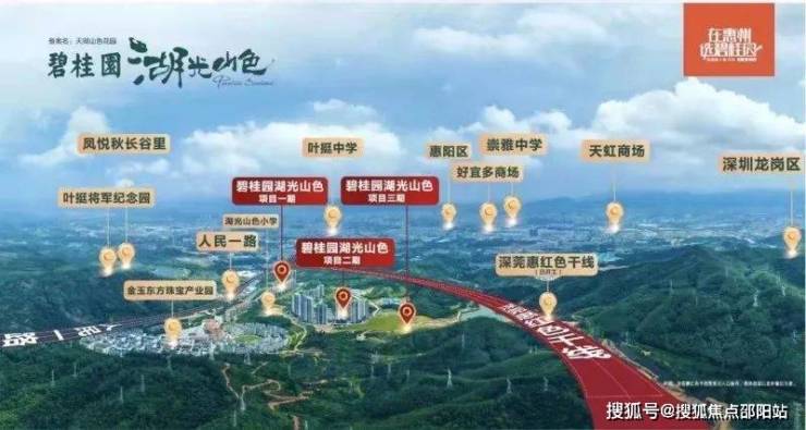碧桂园湖光山色,一山之隔即龙岗,与深圳直线距离仅约4公里,项目旁深莞惠红色干线(快速路)已动工,惠坪高速计划今年10月动工,深圳外环高速已开通,往返深圳更快更便捷;深惠城际已确定设点新圩站,目前深圳段已动工。