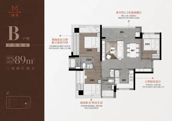 设计的是横厅南北通透格局,进门入户玄关,客餐厅5.2米开间,LDKB一体化,S墙设计预留冰箱卡槽位,三开间朝南,主卧+1个次卧双面大飘窗,客餐厅出5.2米宽景阳台,U型厨房,公卫三段式分离,得房率76.77%(不含赠送),套内面积68.95㎡,阳台主朝西北向。