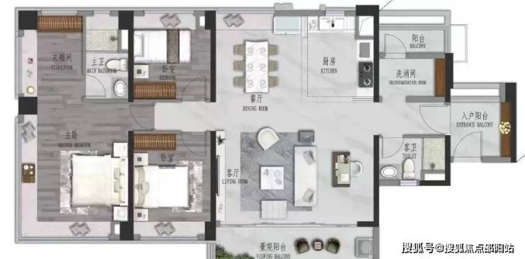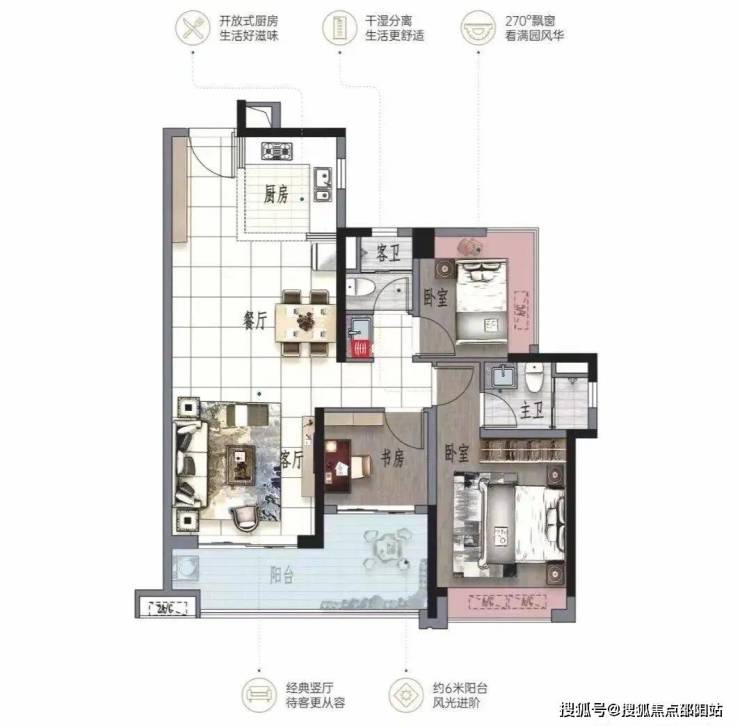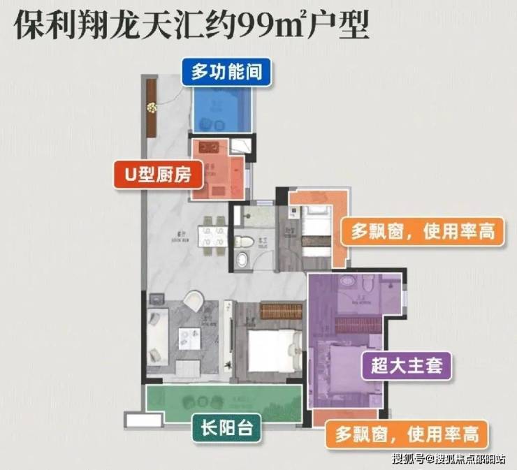 建面99平3+1房,南向6米阳台,主卧套房设计,分东南西南。