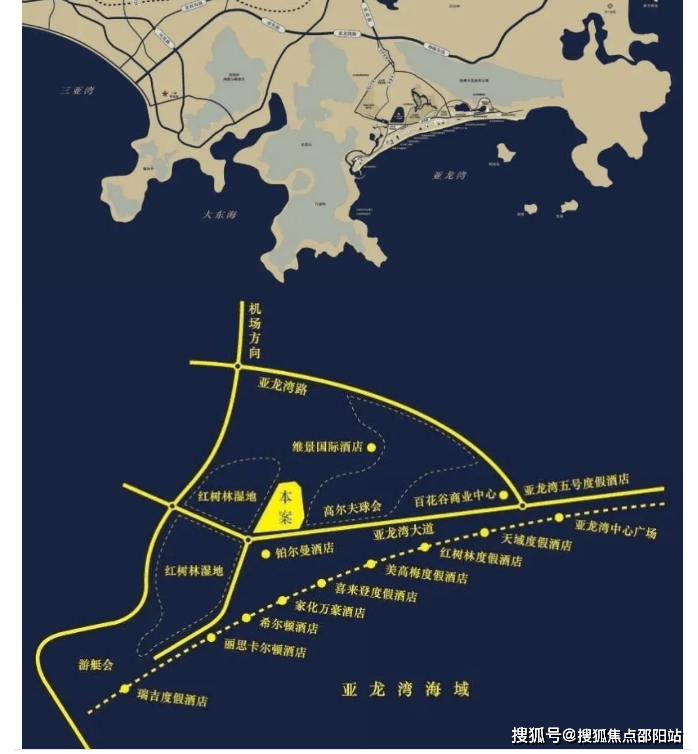 地理位置:地处亚龙湾核心区域,紧邻红树林湿地公园与亚龙湾高尔夫球会,距海边约600米,周边汇聚希尔顿、丽思卡尔顿等25家国际五星级酒店,交通便利,距三亚凤凰机场约29公里。
