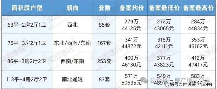 宝安沙井,卓越前海未来城(备案名:蔚蓝海尚花园)于2025年4月18日取证入市,本次推出1栋1/2单元,共588套房源,面积有63㎡的2房1卫,76㎡的3房1卫,86㎡的4房2卫,113㎡的4房2卫户型,备案均价4.59万/㎡,备案单价4.21-5.15万/㎡,总价272-583万/套,预计在2026年12月份带精装交房。