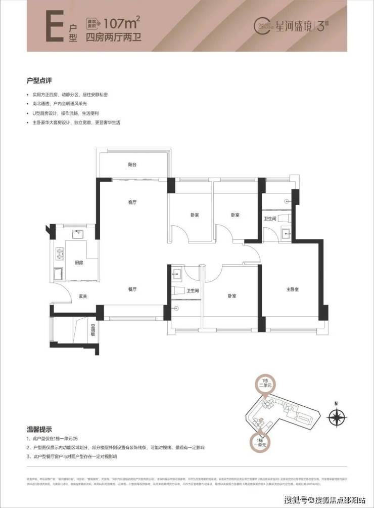 107㎡的4房2厅2卫,设计的是竖厅南北通透格局,进门送入户玄关,全屋飘窗设计,主卧大套房设计,U型厨房,卫生间干湿分离,得房率80.09%(不含赠送),阳台主朝西北朝向。