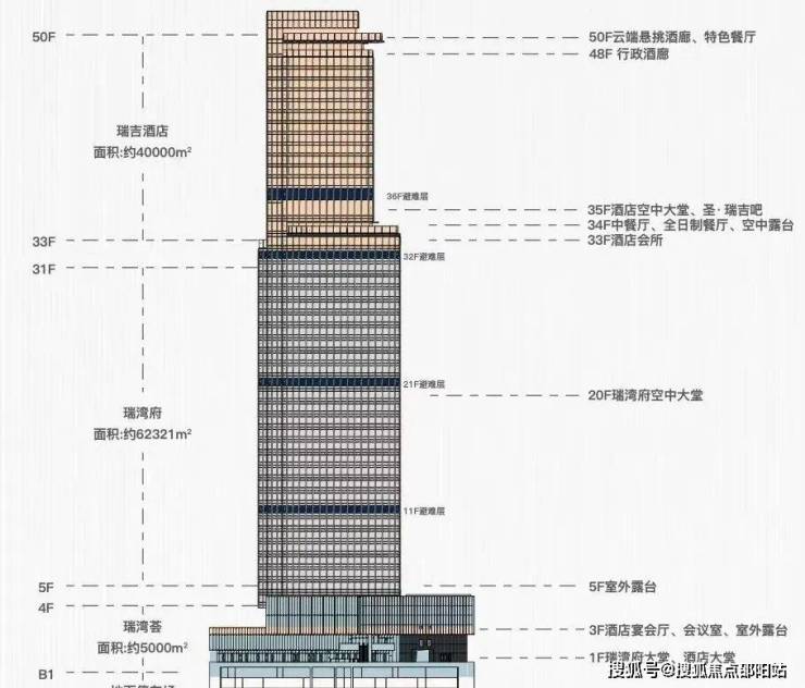 项目总占地约7700㎡,建筑面积约10.7万㎡,其中包含了约4万㎡瑞吉酒店、6.2万㎡企业会馆瑞湾府以及5000㎡瑞湾荟商业,是一个集企业会馆、五星级奢华酒店、精致商业于一体的垂直综合体。