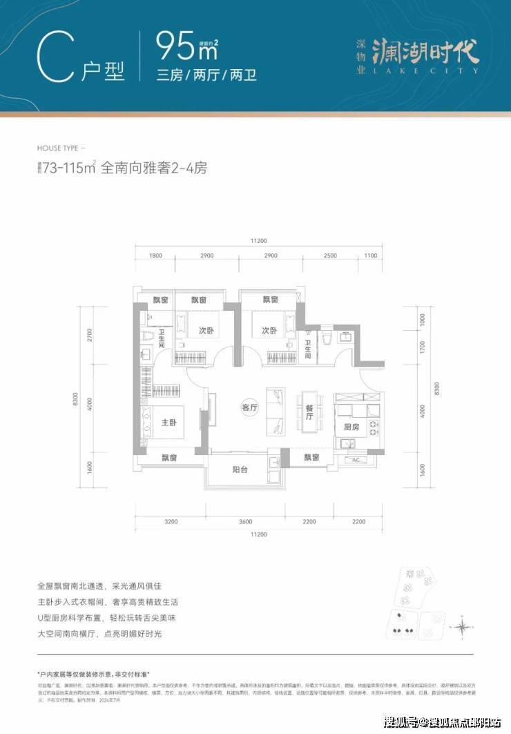 95㎡的3房2厅2卫,设计的是横厅南北通透格局,客餐厅一体化5.8米开间,3个卧室分别做到了3.2米/2.9米/2.9米的宽度,主卧套间设计,U型厨房,卫生间干湿分离,得房率77-78%(不含赠送),阳台主朝西南或东南向。