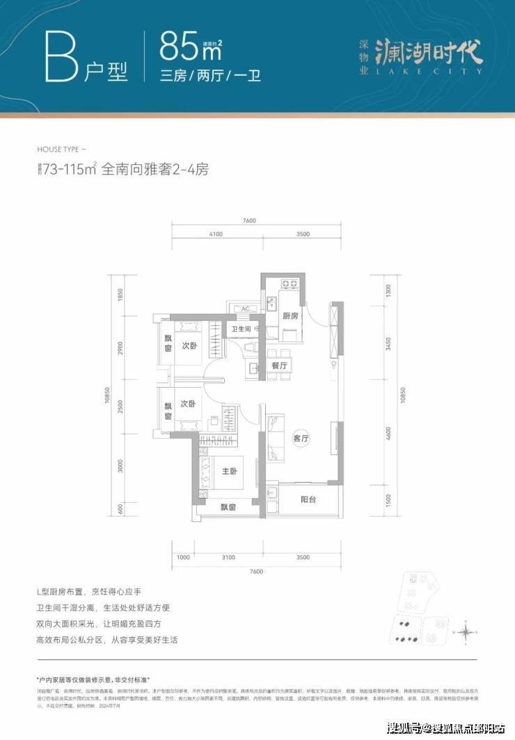 85㎡的3房2厅1卫,设计的是竖厅格局,客厅3.5米开间,LDKB一体化设计,3个卧室分别做到了3.1米/2.9米/2.5米的宽度,L型厨房,卫生间三段式分离,得房率77-78%(不含赠送),阳台西南或东南朝向。
