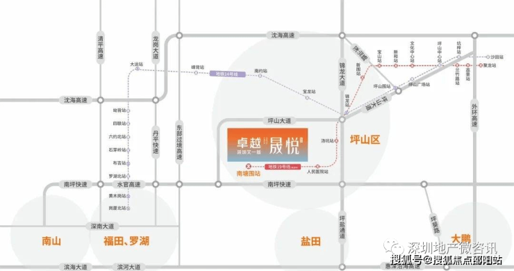 超集快速畅达:南坪快速、东部过境通道、坪盐通道,3条快速速抵罗湖福田,约15km盐田沙头角、约25km罗湖莲塘/香港、约35km福田、约40km南山