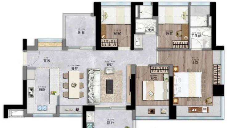 南向采光:约86㎡三房两卫实现三开间朝南,约113㎡四房两卫实现五开间朝南,全明通透