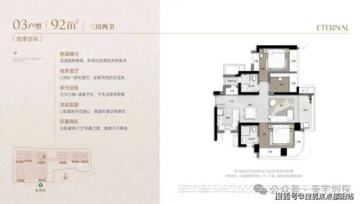 92m²的3房2厅2卫,双龙抱珠格局,客厅3.2米开间,LDKB一体化宽厅,主卧套房270°环幕凸窗,七大凸窗+设备平台,U型厨房,卫生间干湿分离。阳台正东朝向,得房率76%(不含赠送,套内面积69.86㎡)。