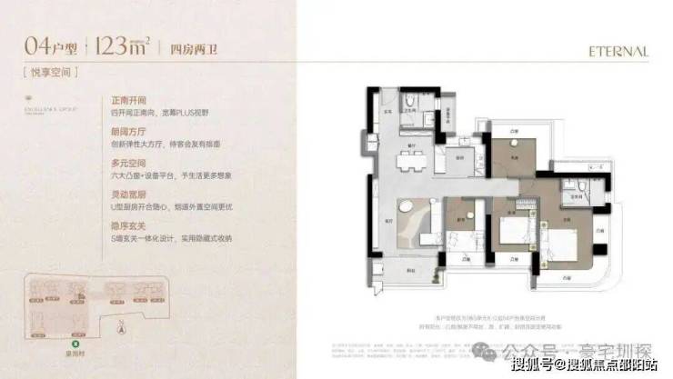 123m²的4房2厅2卫,竖厅格局,客厅4.2米开间,LDKB一体化弹性大方厅,S墙设计预留冰箱卡槽位,四开间朝南,动静分区,主卧套房270°环幕凸窗,六大凸窗+设备平台,U型厨房,卫生间干湿分离。阳台正南朝向看皇岗公园,得房率76%(不含赠送,套内面积93.94㎡)。