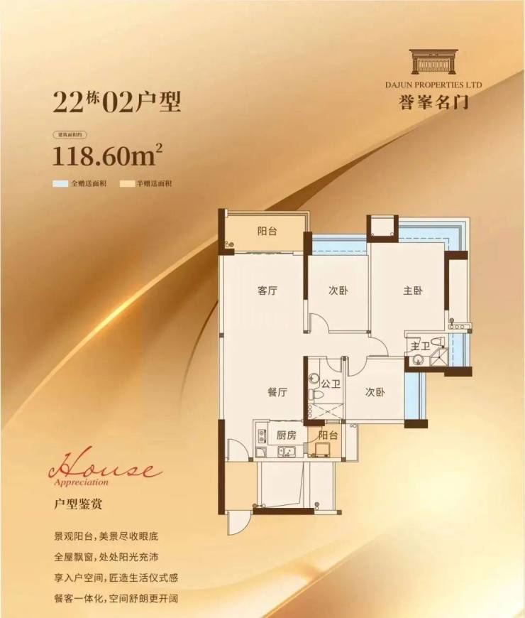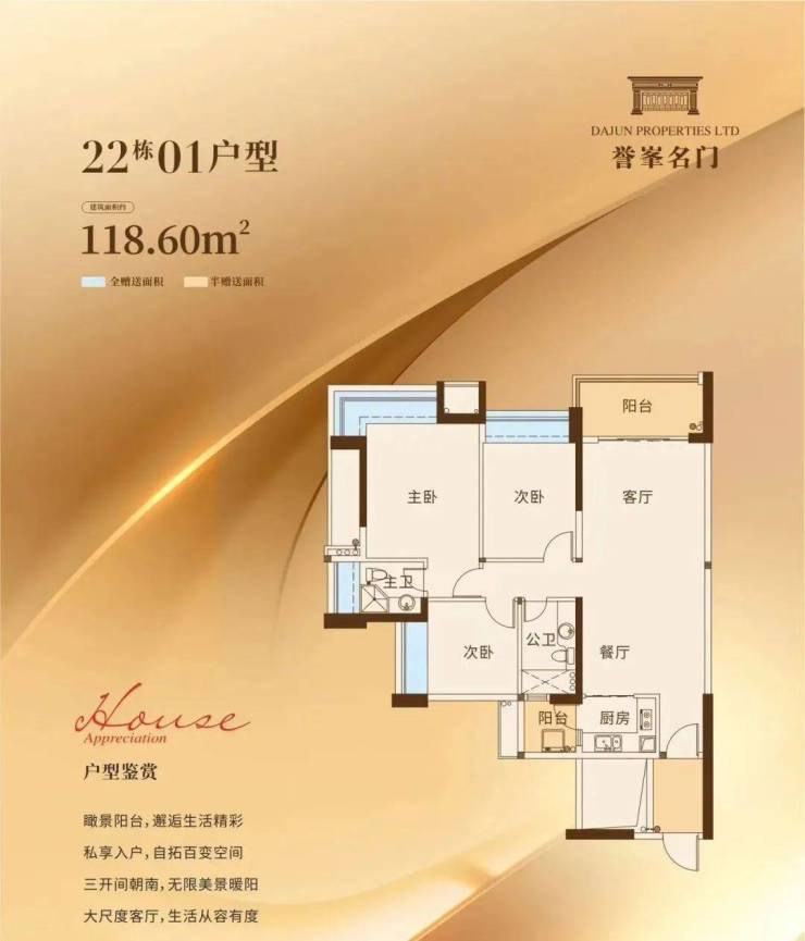 誉峯名门推出的全新精品住宅,将空间美学发挥到极致,每户均朝南设 计,确保全明采光。住户可尽享超大入户花园,自由打造归家的仪式感。户型设计通透舒适,高使用率让功能区布局更加清晰,满足每位家庭成员的不同兴趣爱好,营造专属的生活空间。