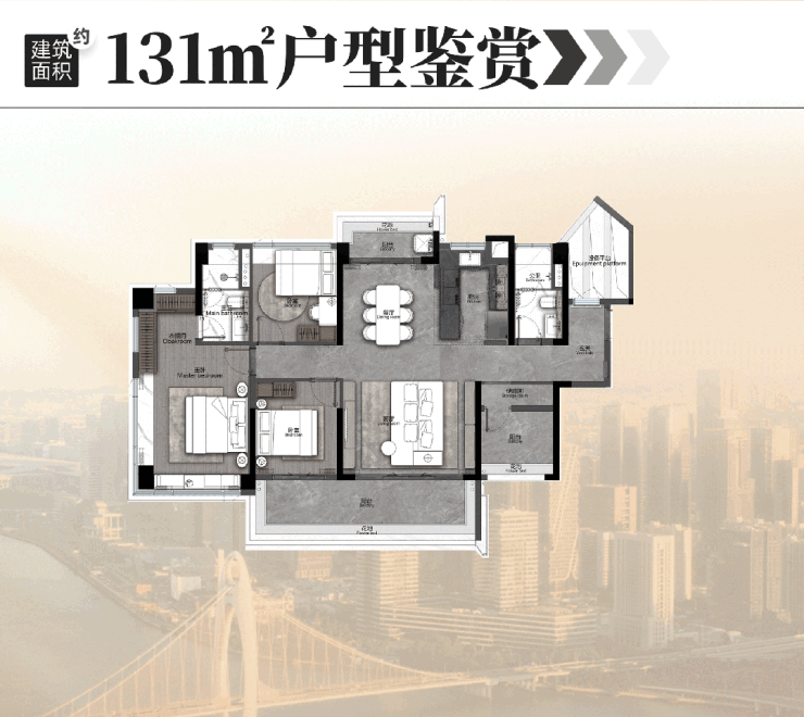 如设备空间、厅卧都可做灵活空间,相当于在三房基础上,再多两个多功能室,这是同面积段户型无法匹及的格局。