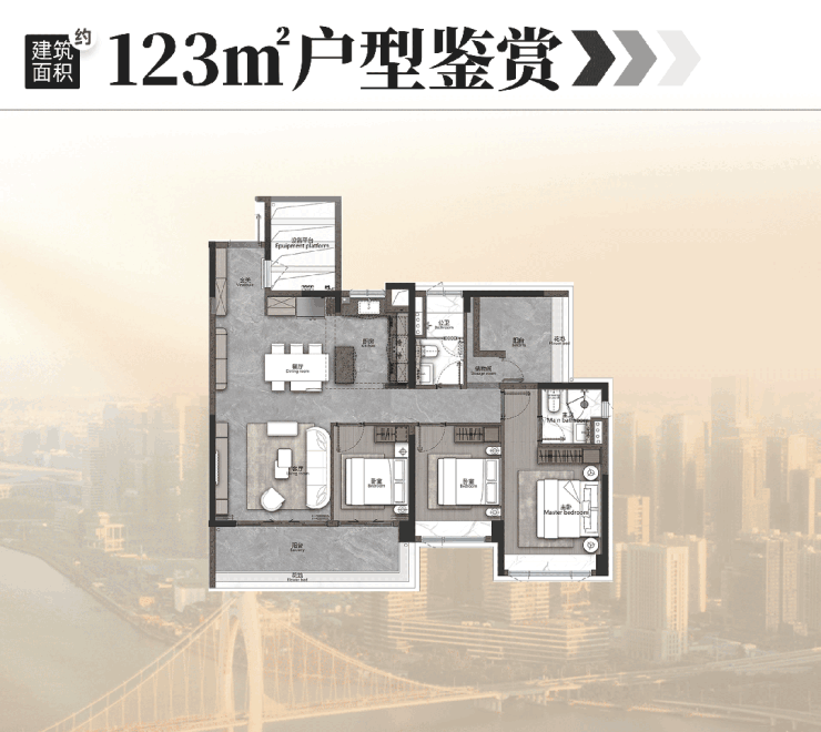 该户型可南望海珠湿地公园,昼夜间能独享湿地公园景色,这通常是约200㎡以上大平层的私享,珑璟台约123㎡即能拥有!