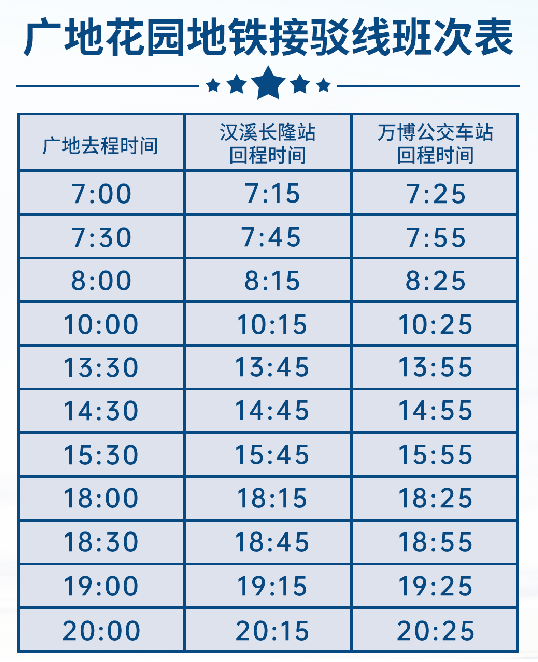 线路有3号线、7号线、18号线,有3大地铁站环绕大石站,汉溪长隆站,南村万博站,增加出行选择。但是距离较远,不过小区3条楼巴专车路线通往各方向。小区楼巴专线接驳地铁南村万博站(7分钟)和汉溪长隆站(10分钟),可乘坐地铁3-7-18号线。