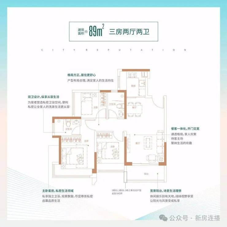 89平:3房2厅2卫,朝西南/东南,套内使用率74.71%(不包含赠送)