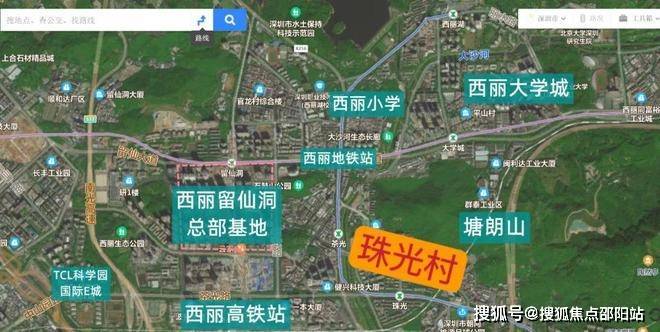 事实上,珠光村的整体区位较为优越,具体位置方面,该项目附近有7号线地铁站珠光站和茶光站,直线距离分别约400米和700米,从茶光站出发一站即到西丽地铁站(5号线环中线和7号线的换乘站),另外项目2公里范围内还规划有西丽高铁站。