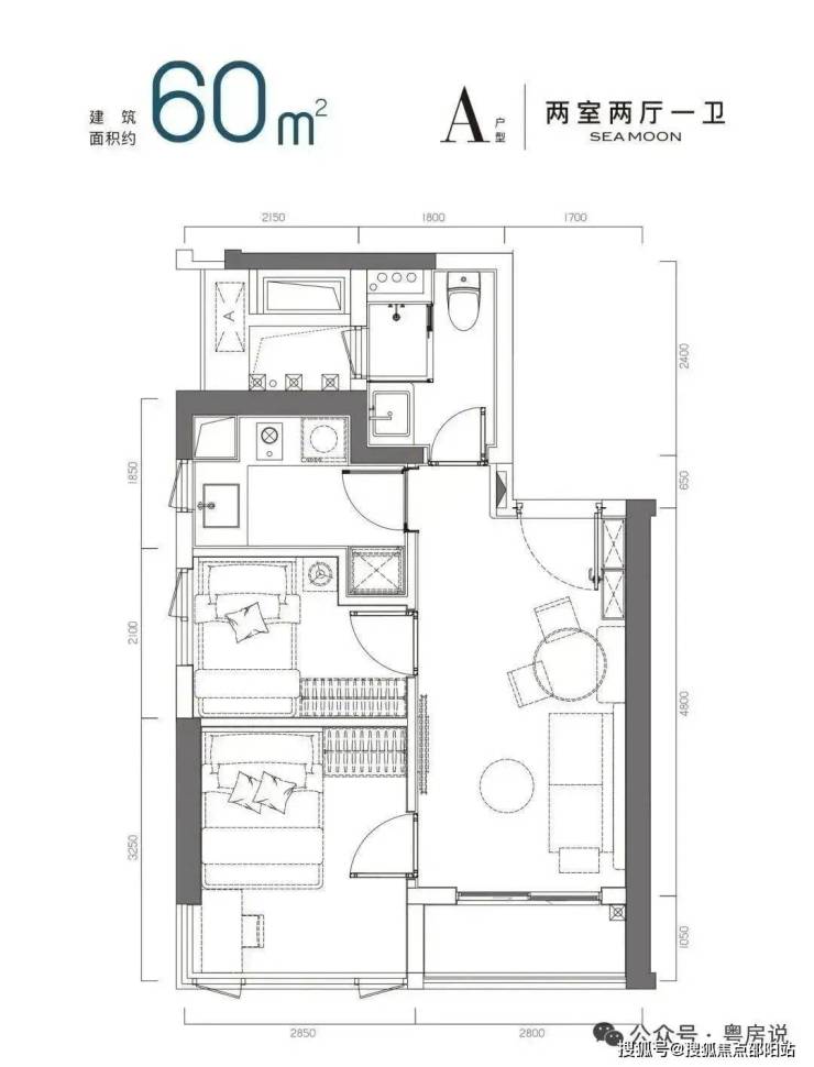 60㎡左右的两房一厅A户型 备案总价约:472-588万