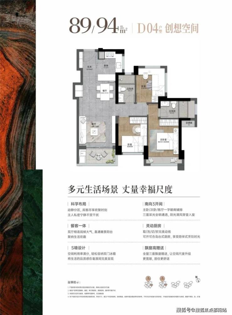 89-94㎡的4房2厅2卫,03.04户型,设计的是经典竖厅格局,进门入户玄关,客厅实测3.245米开间,LDKB一体化,S墙设计预留冰箱卡槽位,三开间朝南,3个卧室分别做到了主卧13.76㎡/次卧8.28㎡/次卧7.74㎡(实测面积,不含墙体),U型灵动式厨房,卫生间干湿分离,得房率约76-81%(不含赠送),东南朝向。