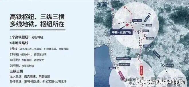 1、双地铁上盖综合体:地铁6号线、13号线(建设中)公明广场站连通地下商业,6号线已通车;