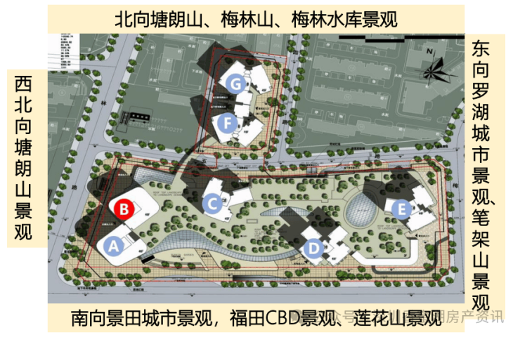 景观资源:北侧远眺梅林水库,东南远望莲花山公园,南侧可观香蜜湖片区及高尔夫球场,具有良好的景观资源,具备建设超高层的景观优势