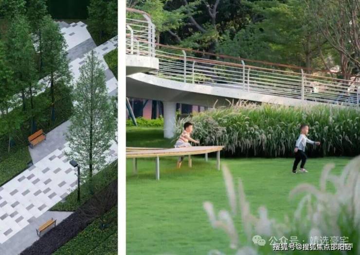 项目匠造约2.5万㎡中心花园,阶梯式双层园景,下层与商业相连活力满分,上层静谧私享,现代简约审美,以园林谧境回应新贵都心绿洲向往。