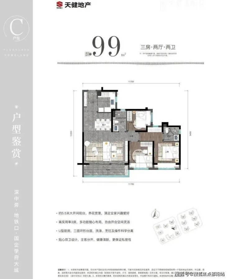 99㎡的3房2厅2卫:设计的是经典竖厅格局,可以改4房,进门入户玄关,客厅5.3米开间,三开间朝南,U型厨房,公卫三段式分离,得房率81.7%(不含赠送),阳台朝西南向。