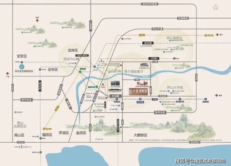 天健和悦府:位于坪山区石井街道金田路与绿荫南路交汇处西北侧,项目地处燕子湖片区,西北部为燕子岭公园,坪山河自西向东贯穿而过,区内汇聚了山、水、田、林、湖、草等多要素,得天独厚“看山、见田、拥河、揽湖”的生态优势是深圳市独一无二的生态资源,片区西侧的深圳坪山燕子湖国际会展中心,与深圳国际会展中心,深圳会展中心也是形成了一城三馆的格局。