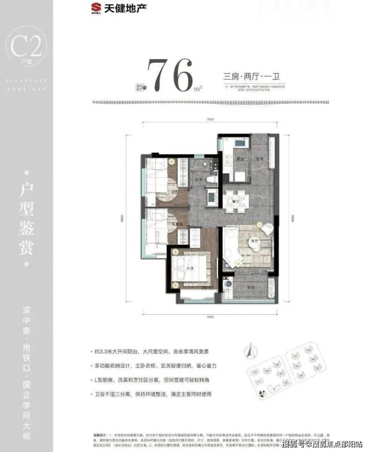 76㎡的3房2厅1卫:设计的是竖厅格局,进门入户玄关,客厅3.3米开间,L型厨房,卫生间三段式分离,得房率75.05%(不含赠送),阳台朝西北、西南或东北向。