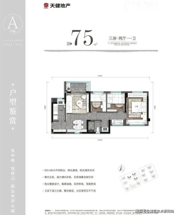 75㎡的3房2厅1卫:设计的是竖厅南北通透格局,进门入户玄关,客厅3.4米开间,L型厨房,卫生间三段式分离,得房率81.3%(不含赠送),阳台朝西北或东北向。