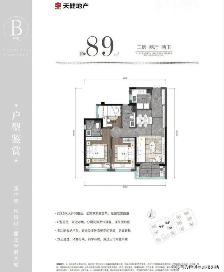 89㎡的3房2厅2卫:设计的是经典竖厅格局,进门入户玄关,客厅3.5米开间,三开间朝南,U型厨房,公卫三段式分离,得房率81.3%(不含赠送),阳台朝西南或东南向。