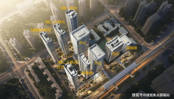 共由四栋54-64层的超高层住宅+两栋保障性住房+三栋办公楼组成,另外配建一所12班幼儿园。