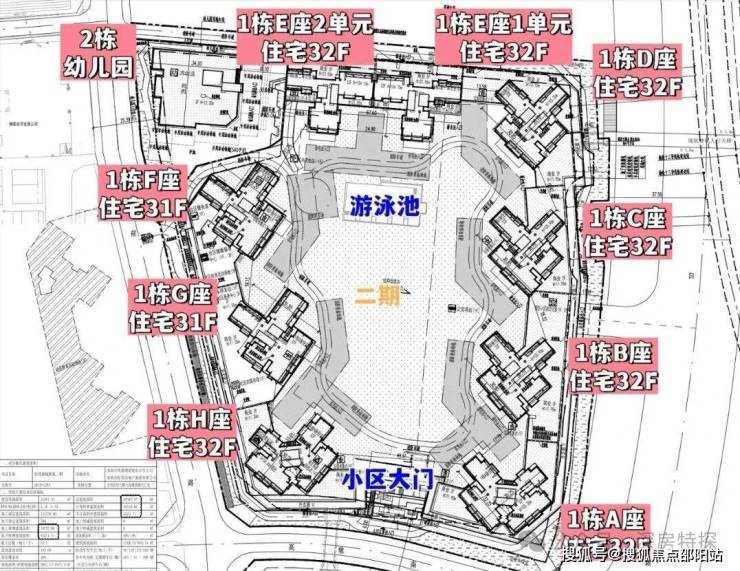 二期总建筑面积约20.74万㎡,计容建筑面积约14.24万㎡,共由9栋总高32F的住宅组成,另外还规划有1所9班制幼儿园,总规划1225户,全部是商品房,回迁房暂不确定,小区还规划了菜市场,公交首末站,社区服务中心等,停车位1548个。