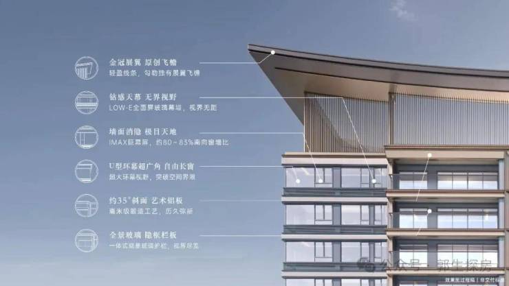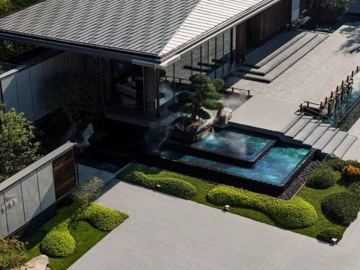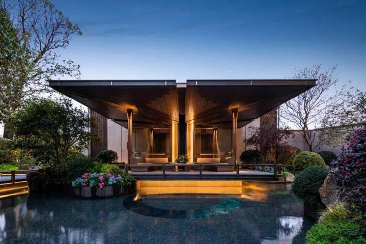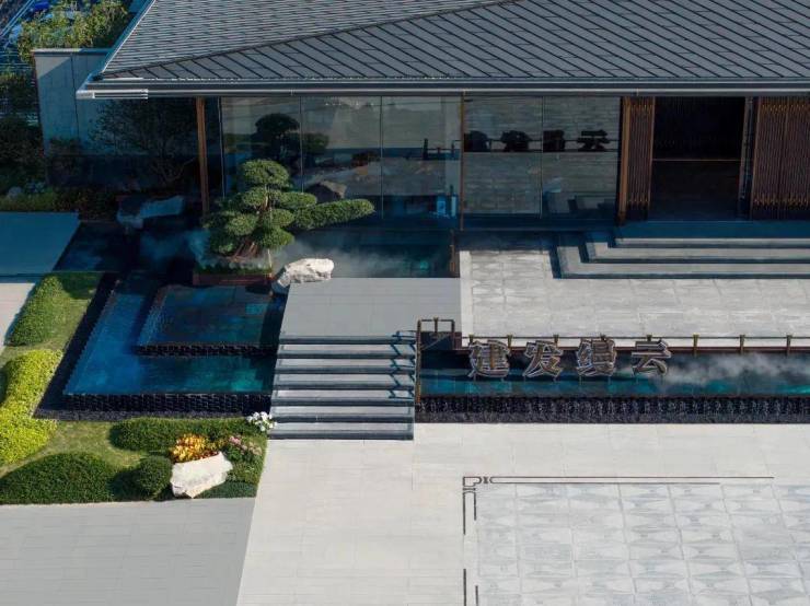 建发缦云的建筑外观上,通过展翼飞檐、钻感大面LOW-E玻璃、墙角270°无柱脚转脚玻璃,及去形留意的造园手法,新中式高定营造感十足。