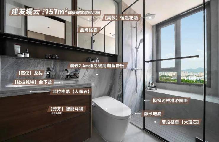 建发缦云深谙其道,更是以实际的行动来践行自己的承诺,在原装标含全屋大金空调、百朗新风系统、博世厨具三件套(灶台、抽油烟机和洗碗机)、卫生间全配德系高端卫浴品牌(杜拉维特台盆、瑞士劳芬一体智能马桶和高仪的龙头花洒......)等本就足够顶流的标准下,又增投数千万,用于项目装标的提升:卫生间洗手台面的雪山蓝奢石、墙面的雪山蓝岩板、且主卧卫生间中增加了美妆冰箱。