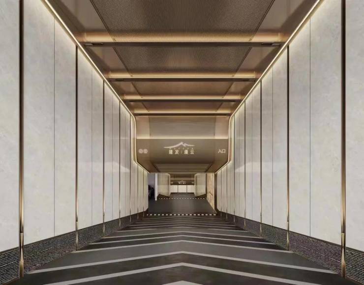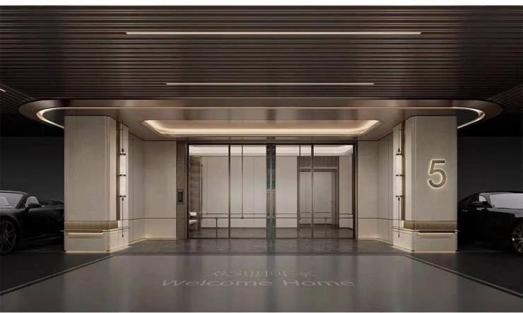 地下精装入户堂采用水磨石地花整铺,嵌入定制铜图案,叠加3.3米的大堂净高,呈现由内而外的精奢品质,回家的仪式感再次得到提升。