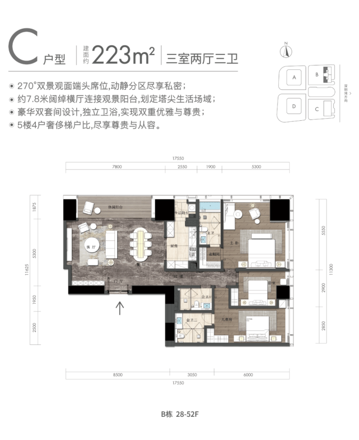 3房户型为223平双套间;